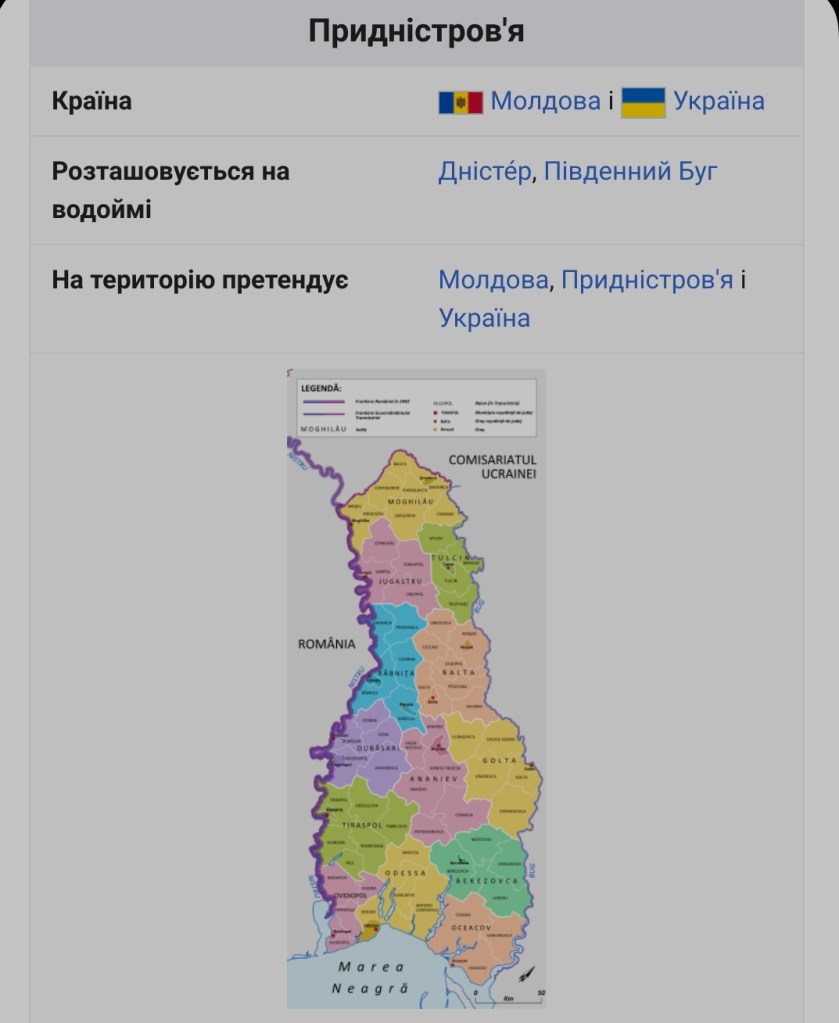 🐙 Придністров’я — регіон на вздовж лівого берега річки Дністер, Україна та Республіка Молдова. Історичний край, заселений переважно українцями (русинами) та молдованами (волохами). Поділяється на північну (подільську) і південну (степову) частини. До подільського Придністров’я належать Кам’янка, Рибниця, Рашків; до степового — Тирасполь, Дубоссари, Слободзея. Подільське Придністров’я входило до складу Великого князівства Литовського, Речі Посполитої, Гетьманщини, степове Придністров’я — до складу Золотої Орди, Кримського ханства, Османів. З кінця XVIII ст. північна і південна частині об’єднані у складі Російської імперії (Подільська губернія і Херсонська губернія). У 1918 році належало УНР (Подністров’я), згодом — Радянській Україні. 1940 року передане радянською владою до складу Радянської Молдови.