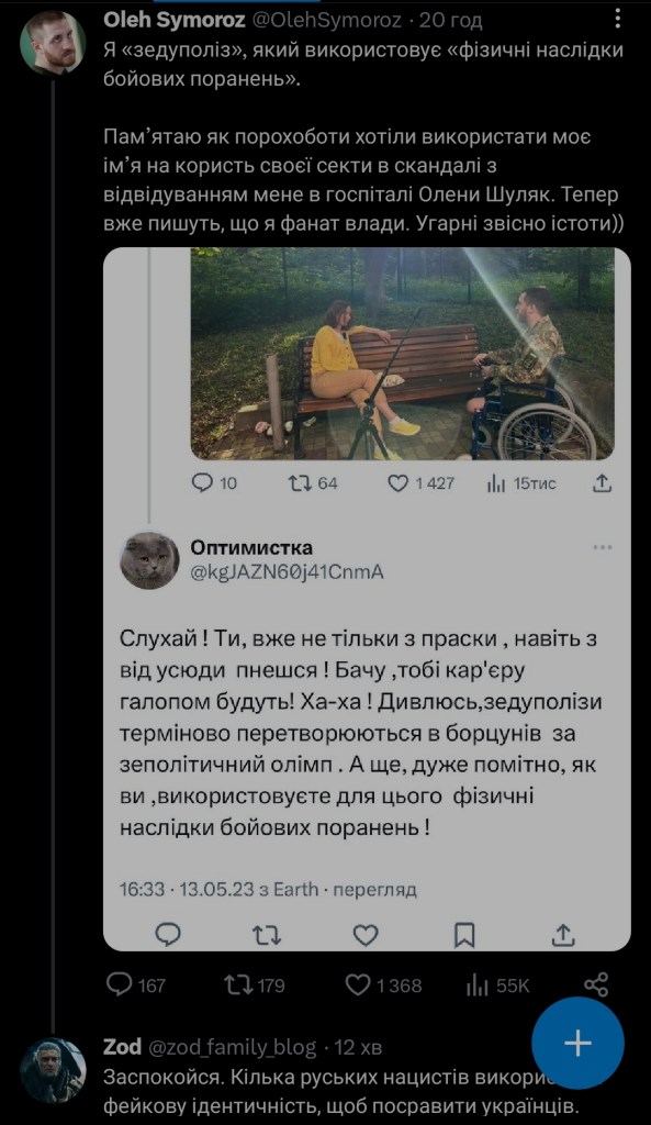 Чому Oleh Symoroz не помітив насмішки від Олена Шуляк на зразок “Ви ж тут не бачите, що відбувається в Києві”,- це не дослівно, попереджаю.